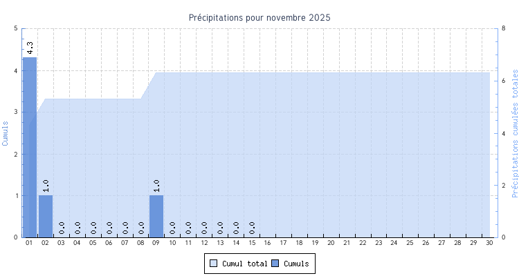 | 09 | 4.8 °C à 00:20 | 17.5 °C à 18:05 | 6.8 °C | 0.6 km/h (6.1 km/h) | 199 |