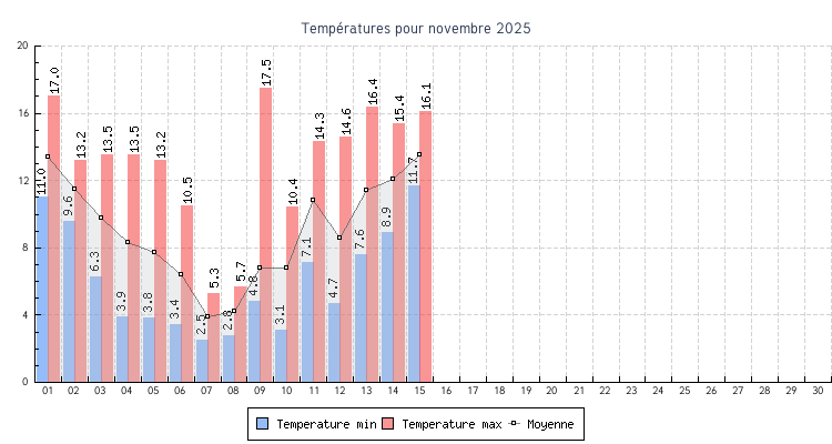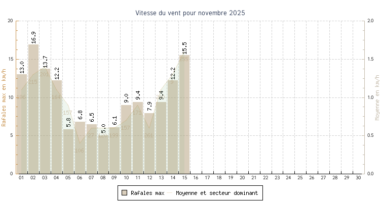 | 15 | 11.7 °C à 03:30 | 16.1 °C à 13:55 | 13.5 °C | 1.6 km/h (15.5 km/h) | 255 |